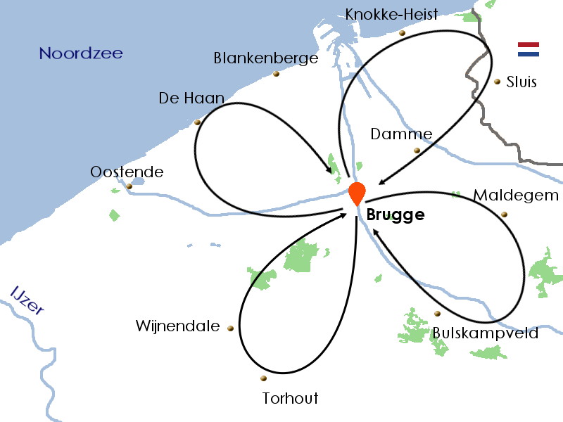 Weitere Sternradtouren bringen Sie in das charmante Polderdorf Lissewege sowie in das elegante Seebad De Haan, das bis heute seine Belle-Époque-Atmosphäre bewahrt hat. Naturfreunde genießen außerdem die Route rund um Bulskampveld mit Wäldern, Kanälen und historischen Abteien.